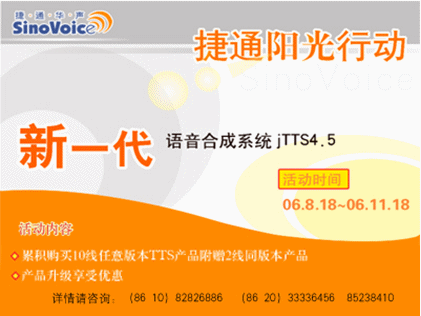 2006年8月18日,北京捷通華聲語音技術(shù)有限公司正式發(fā)布捷通華聲新一代語音合成系統(tǒng)jTTS4.5。為慶祝jTTS4.5的正式上市,同時也為回饋廣大用戶,為期三個月,推廣jTTS4.5的捷通華聲“陽光行動”同步全面啟動!