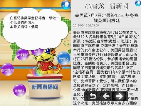 CTI論壇(ctiforum)5月17日消息(記者 歐陽): 2012年5月9日,中國第一個(gè)全方位智能交互手機(jī)助手“小唐龍”正式上線,小唐龍是一個(gè)基于Android系統(tǒng)的智能手機(jī)助手,它可隨時(shí)隨地幫助手機(jī)用戶進(jìn)行聊天、歌曲點(diǎn)播、聽新聞、地圖導(dǎo)航、互聯(lián)網(wǎng)信息查詢等多方面服務(wù),其中《唐龍新聞》以新穎獨(dú)特成為小唐龍的閃亮點(diǎn)。當(dāng)拿起手機(jī)對(duì)著“小唐龍”說,“聽新聞”,“小唐龍”的播報(bào)便即刻開始——天下大事早知道,由我唐龍給您報(bào),我們來看今天的唐龍新聞。