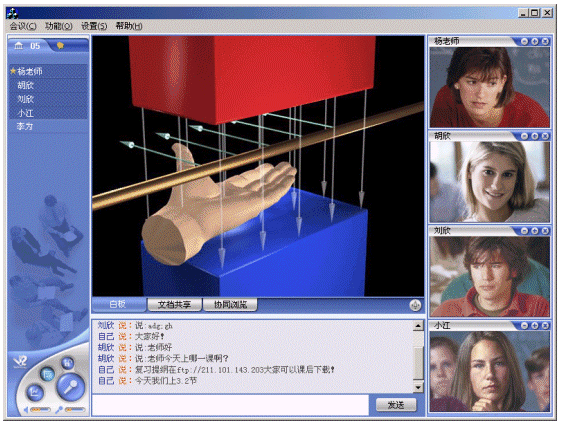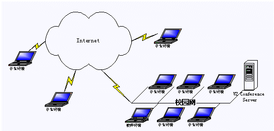 應(yīng)用V2 遠程教育平臺,教學和遠程培訓都可以在線進行。學生和教師利用各自的客戶端通過網(wǎng)絡(luò),進入一個虛擬課堂,在教師與學生、學生與學生之間建立起語音和視頻的雙向交流、課件教學、在線會話和白板溝通的環(huán)境,實現(xiàn)教學功能。