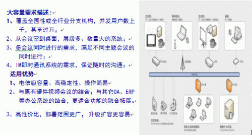 太平洋保險(xiǎn)集團(tuán)下根據(jù)業(yè)務(wù)模式劃分為產(chǎn)險(xiǎn)、壽險(xiǎn)2個(gè)公司,每個(gè)公司在全國(guó)各省都有分公司,目前集團(tuán)公司管理著主服務(wù)器,每個(gè)分公司都有自己的從服務(wù)器,總計(jì)60余臺(tái)從服務(wù)器,應(yīng)用的交互點(diǎn)數(shù)1000點(diǎn),旁聽(tīng)點(diǎn)數(shù)300點(diǎn)。保險(xiǎn)行業(yè)銷售人員流動(dòng)快、各種培訓(xùn)頻繁、新險(xiǎn)種推出層出不窮,其中省分公司、眾多支公司與銷售網(wǎng)點(diǎn)人員的即時(shí)音視頻交流是重中之重,為了滿足客戶要求系統(tǒng)平臺(tái)支持大容量會(huì)議人數(shù)、多會(huì)議同時(shí)召開(kāi)以及流暢的音視頻交換的要求,國(guó)際視訊知名廠商北京威速科技有限公司專門為大企業(yè)級(jí)用戶開(kāi)發(fā)出了高性能大容量的視頻會(huì)議產(chǎn)品。這種更適用組織機(jī)構(gòu)龐大、更穩(wěn)定的純軟件網(wǎng)絡(luò)視頻會(huì)議平臺(tái),是迄今為止業(yè)內(nèi)唯一勝任單會(huì)議室同時(shí)容納千人以上用戶開(kāi)會(huì),并支持無(wú)限量會(huì)議室,并且通過(guò)級(jí)聯(lián)技術(shù)可以同時(shí)支持幾千路音視頻交互并發(fā),同時(shí)實(shí)現(xiàn)一個(gè)集視頻交互、音頻交互、屏幕廣播、遠(yuǎn)程控制、文字交流、電子白板、文檔共享、文件傳輸?shù)榷囗?xiàng)功能于一體的綜合多媒體遠(yuǎn)程會(huì)議平臺(tái)。自V2 conference應(yīng)用以來(lái),承擔(dān)了公司絕大部分遠(yuǎn)程交流任務(wù),太平洋保險(xiǎn)集團(tuán)已把視頻會(huì)議交流當(dāng)作工作的一部分,成為工作之必須的習(xí)慣。極大地提高了企業(yè)運(yùn)作效率、降低了成本,而這些正是金融保險(xiǎn)機(jī)構(gòu)的制勝之道。