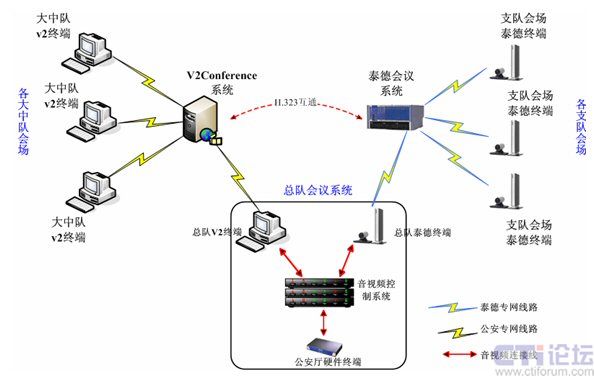 另外在廣東省消防信息系統(tǒng)內(nèi),現(xiàn)有硬件泰德電視電話會(huì)議系統(tǒng)共有23個(gè)終端節(jié)點(diǎn),主要基于獨(dú)立的IP專用網(wǎng)絡(luò),并與V2conference系統(tǒng)所在IP網(wǎng)絡(luò)相互獨(dú)立。為了達(dá)到和硬件系統(tǒng)共用互通,實(shí)現(xiàn)全網(wǎng)會(huì)議互通,在總隊(duì)會(huì)議系統(tǒng)中,將會(huì)議系統(tǒng)一級(jí)網(wǎng)(省公安廳——消防總隊(duì))、二級(jí)網(wǎng)(消防總隊(duì)——支隊(duì))、三級(jí)網(wǎng)(消防支隊(duì)——消防大中隊(duì))通過消防總隊(duì)會(huì)議控制系統(tǒng)和v2conference系統(tǒng)自帶的H.323互通功能模塊融合到一起。