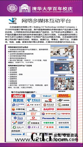 CTI論壇(ctiforum)5月3日消息(記者 張潔): 天行健,君子以自強不息,地勢坤,君子以厚德載物。2011年4月23日,清華大學迎來百年華誕。在建校百年之際,V2威速聯(lián)合母校----清華大學百年校慶辦展出了V2網(wǎng)絡多媒體互動平臺。V2威速眾多旗艦產(chǎn)品之一----V2網(wǎng)絡多媒體互動平臺始創(chuàng)于1999年清華大學第二屆“大學生創(chuàng)業(yè)比賽”。同年,V2威速于清華創(chuàng)業(yè)園創(chuàng)立,經(jīng)過11年的發(fā)展,V2威速已是中國值得信賴的多媒體通訊產(chǎn)品及解決方案供應商。