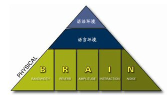 要達(dá)到清晰易懂的談話效果需要五個要素的配合:帶寬(Bandwidth)、回響(Reverberation)、振幅(Amplitude)、交互性(Interaction)、噪音水平(Noise)。任何一個會議系統(tǒng)的職責(zé)就是自動調(diào)節(jié)和平衡這五個要素,使進(jìn)行交談的雙方都盡可能獲得最佳的聽覺享受。在英文里,我們可以用每個單詞的首字母來記憶這五個特征,即:BRAIN模型。