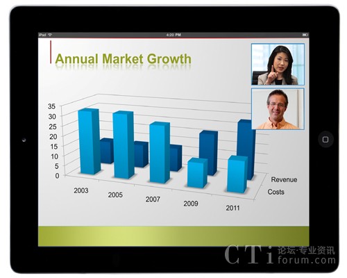 現(xiàn)在,在視頻通信需求增長、勞動力越來越偏遠(yuǎn)以及技術(shù)進(jìn)步的推動下,移動視頻會議正在顯著增長。今天的企業(yè)往往在地域上越來越分散,越來越虛擬,全球遠(yuǎn)程辦公人員已超過10億。同時,技術(shù)的進(jìn)步也推動了視頻移動社會,包括配有攝像頭的移動平板電腦和智能手機(jī)的普及;3G、4G和Wi-Fi網(wǎng)絡(luò)的出現(xiàn);以及云服務(wù)。事實上,Gartner仍然看好多媒體平板電腦市場帶來的機(jī)會,據(jù)他們預(yù)測到2015年平板電腦將售出3.2億部,到年底,累計銷售將超過9億部。到2015年,采用視頻聊天的人數(shù)預(yù)計將增長14倍,超過1.4億人。