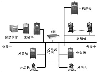 在每個分局和信息中心機房設(shè)置分會場,實現(xiàn)網(wǎng)絡(luò)視頻會議和遠(yuǎn)程技術(shù)支持。分會場的會議終端設(shè)備選用VCON的會議室型柜式終端MediaConnect