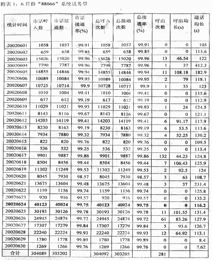 系統(tǒng)在2002年6月份的系統(tǒng)話務(wù)量情況見(jiàn)附表1。