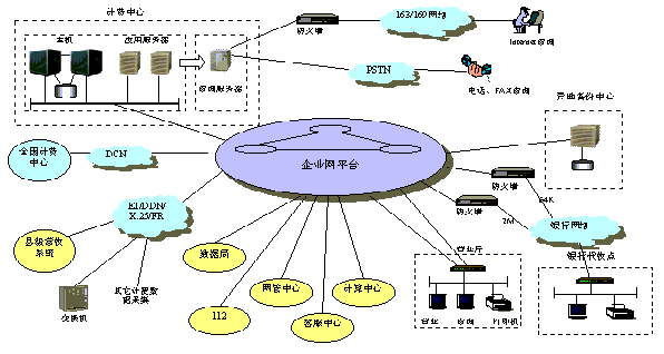 縣計費中心采用64K DDN連接各營業(yè)廳和支局,縣銀行通過銀行網(wǎng)絡連入企業(yè)網(wǎng)平臺,鄉(xiāng)鎮(zhèn)代收點視具體條件的不同可采用DDN、ISDN或PSTN方式連入計費中心。