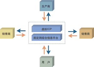 讓我們看看這樣一個(gè)應(yīng)用,以固定網(wǎng)綜合信息平臺為基本支撐平臺,以“虛擬ICP”為業(yè)務(wù)承載平臺,包含了銷售商、生產(chǎn)商、供應(yīng)商、消費(fèi)用戶,形成了一個(gè)初步完整供應(yīng)鏈系統(tǒng),如圖所示。