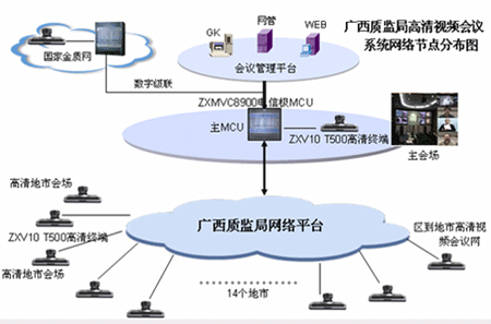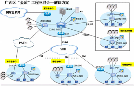 憑借全面的融合通信產(chǎn)品和解決方案、豐富的電子政務(wù)工程建設(shè)和實(shí)施經(jīng)驗(yàn),中興通訊為廣西“金質(zhì)工程”(一期)系統(tǒng)“量身定做”出一整套基于IP融合、使用方便靈活的解決方案:將整個(gè)系統(tǒng)分為兩個(gè)部分,即區(qū)質(zhì)監(jiān)局一級節(jié)點(diǎn)信息中心、各地市質(zhì)監(jiān)局及相關(guān)研究機(jī)構(gòu)共計(jì)15個(gè)二級節(jié)點(diǎn)信息中心,在管理上體現(xiàn)垂直的系統(tǒng)架構(gòu)。整個(gè)網(wǎng)絡(luò)可以看作一個(gè)分級的星形網(wǎng)絡(luò),結(jié)構(gòu)簡單、易于擴(kuò)展。
