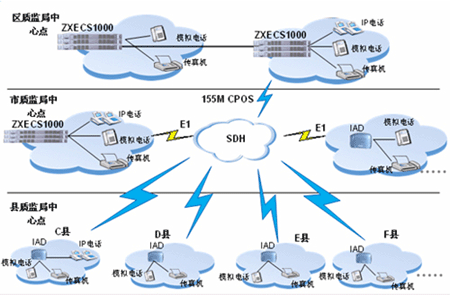 其它各接入節(jié)點(diǎn)采用IAD設(shè)備接入到ZXECS 1000,最大程度的降低了語音接入的成本,同時(shí)IAD靈活的擴(kuò)展性利于今后的升級。