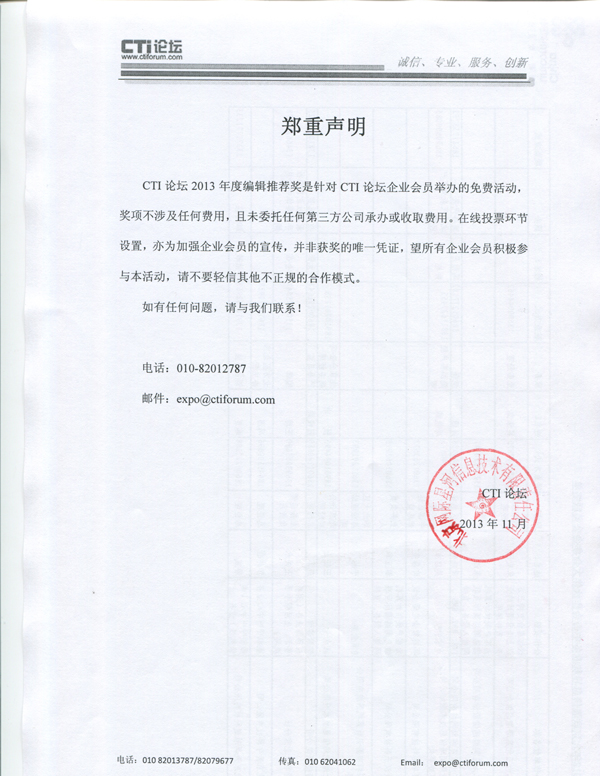 2.將相應(yīng)電子文檔以電子郵件附件形式發(fā)送到:expo@ctiforum.com,郵件主題為:CTI論壇2013年度“編輯推薦獎”