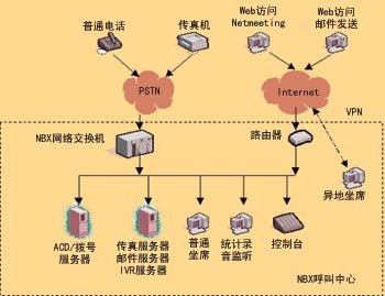 NBX網(wǎng)絡(luò)呼叫中心的核心是3Com公司的NBX網(wǎng)絡(luò)電話交換機,它具有PBX的功能,支持多種外線接入方式,呼入的語音信號轉(zhuǎn)換為數(shù)據(jù)包,在局域網(wǎng)內(nèi)部傳輸,實現(xiàn)局域網(wǎng)內(nèi)部語音、數(shù)據(jù)的統(tǒng)一。坐席可以延伸到數(shù)據(jù)網(wǎng)可以達到的地方(適當?shù)膸挘,而不受地理位置的限制。你可以通過申請各類專線,如VPN、DDN等,將計算機連入呼叫中心,實現(xiàn)分地域、分種類、分數(shù)據(jù)的服務(wù)。NBX網(wǎng)絡(luò)呼叫中心擴大了對外服務(wù)方式,通過上網(wǎng)訪問企業(yè)主頁,并使用Windows集成的Netmeeting軟件通過使用電腦的聲卡、耳機、麥克風直接與服務(wù)代理人員進行語音交流。