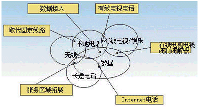 數(shù)據(jù)服務(wù)同本地電話服務(wù)的融合,是不來最重要的融合趨勢(shì)之一,其主要體現(xiàn)在通過本地電話可以解決數(shù)據(jù)業(yè)務(wù)的接入問題,可以提供窄帶或?qū)拵У慕尤肽芰ΑM瑫r(shí),可以為Internet服務(wù),如電子郵件服務(wù)同電話話音服務(wù)結(jié)合起來創(chuàng)造條件。一種未來的發(fā)展方向就是利用電話來接收電子郵件同時(shí)可以用電子郵件的方式閱讀語言信箱中的留言。“聽電子郵件,看語言信箱”是對(duì)這種融合服務(wù)的最好描述。而數(shù)據(jù)業(yè)務(wù)同長途電話業(yè)務(wù)的融合集中于通過VoIP技術(shù)提供長途電話服務(wù),競(jìng)爭收入最大的電信市場(chǎng)。數(shù)據(jù)服務(wù)同有線電視娛樂服務(wù)的融合主要體現(xiàn)在以Cable Modem做為數(shù)據(jù)接入手段和視頻點(diǎn)播這樣的娛樂服務(wù)。通過Cable Modem,有線電視網(wǎng)也可以提供本地電話和長途電話接入業(yè)務(wù),象AT&T和TCI 及MediaOne 正在進(jìn)行的電話業(yè)務(wù)實(shí)驗(yàn)。而寬帶的數(shù)據(jù)接入則為數(shù)據(jù)服務(wù)的寬帶化提供了條件。