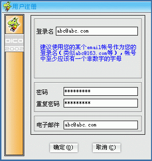 DICO下載后的安裝過程比較簡單: "接收協議"后一路"下一步"就OK了。然后是注冊,過程也委簡單:運行后,第一次使用時點"注冊"(以后使用時只要輸入用戶名或密碼登錄就是了),隨后的"用戶注冊"窗口中填寫好相關的選項后點"確定"(下圖2)就OK了!