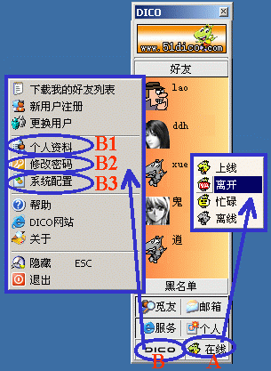 1、在線狀態(tài)設置:點按主窗口右下角(圖3的A處)后,可選擇"上線/離開/忙碌/離線"四種在線狀態(tài)之一;