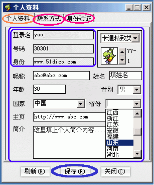 、冱c按"個人資料"命令(圖3的B1處),彈出"個人資料"修改窗口,包括"個人資料/聯系方式/身份驗證"這三大類選項卡。其中:"個人資料"選項卡下,除登錄名、號碼和身份這三項不可更改外,其余各項都是可填或可選項,據你所需進行修改就是了(下圖4)。另外,還有"聯系方式"和"身份驗證"兩大選項,怎么個用法自己點開一看就明白了你!