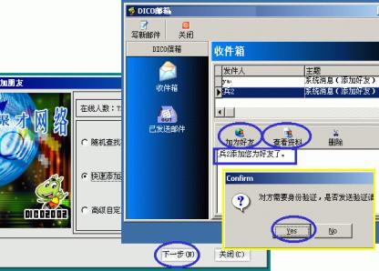 3、點按主窗口下方的"覓友"按鈕,彈出的對話框中選擇三種添加方式之一后按"下一步"進行好友的添加;當有人加你為好友時,系統(tǒng)會有提示音閃并DICO圖標在任務欄不斷閃爍,你點擊上來后會彈出你的DICO郵箱對話框并收到有某某加你為好友的消息,此時可先點按"查看資料"了解一下來人相關信息;若有意可點按"加產好友"加來訪者為好友(下圖7)。