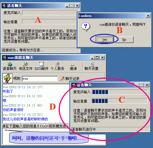 在好友窗口內單擊某"在線好友頭像"后選"語音聊天"命令(或在即時聊天窗口中點按"語音聊天"按鈕)后,主動方彈出"正等待對方應答窗口提示";而被叫方會彈出"應答與否的窗口","YES"后雙方即可聊了(下圖9)。而且,它不受防火墻的限制(下圖就是我與一個在防火墻后的朋友的聊天界面)。在這一點上,QQ就望塵莫及了!