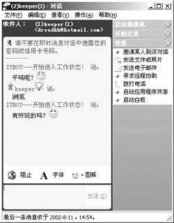 聊天功能是IM軟件最基本、也是最重要的功能,基本上每一種IM軟件在這個(gè)功能上的操作都差不多:如果用戶想與聯(lián)系人進(jìn)行聊天,可以雙擊IM中聯(lián)系人的頭像,在彈出的對(duì)話框中敲入文字信息發(fā)送即可。QQ的特點(diǎn)是可以給不在線的朋友發(fā)送信息,對(duì)方下次上線的時(shí)候可以收到,MSN雖然不具備這樣的功能,但是它在聊天過(guò)程中可以使用各種漂亮的表情圖標(biāo)為聊天添加了不少情趣。