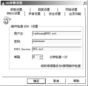IM和E-mail是我們?cè)诰W(wǎng)上最常用的兩種工具,如今不少I(mǎi)M軟件將兩者作了完美的結(jié)合。在QQ中你可以直接給自己的好友發(fā)郵件,而無(wú)須再輸入E-mail地址;此外對(duì)于自己的信箱QQ還有檢查新郵件功能,在“系統(tǒng)參數(shù)”中設(shè)置您自己的E-mail,填好POP3地址,您可以選擇定時(shí)檢查時(shí)間,QQ就會(huì)自動(dòng)檢查有否新郵件到達(dá)。對(duì)于MSN