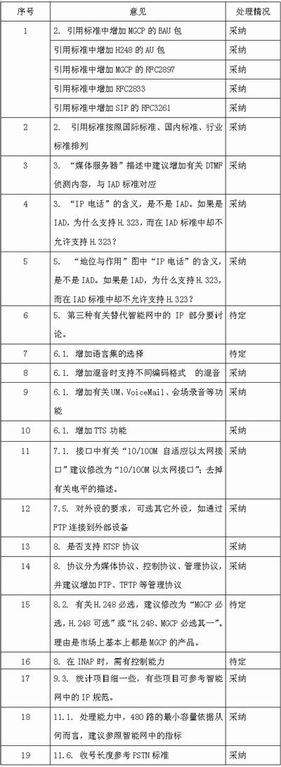 附表:8月1日~2日,網(wǎng)絡(luò)與交換標(biāo)準(zhǔn)研究組對(duì)于“基于軟交換的媒體服務(wù)器的技術(shù)要求”的征求意見選登。