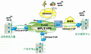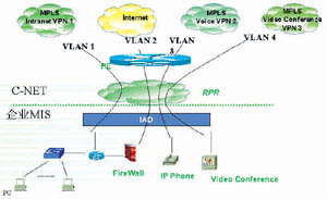 VPN中,實(shí)現(xiàn)業(yè)務(wù)在VLAN 和VPN中的無縫對(duì)接,以保證用戶數(shù)據(jù)的安全、高效傳輸;接入網(wǎng)采用基于RPR或SDH的MSPP環(huán)實(shí)現(xiàn)IP業(yè)務(wù)和TDM業(yè)務(wù)的綜合傳輸;在商業(yè)樓宇內(nèi)主要采用IAD設(shè)備將客戶的數(shù)據(jù)、語音、專線等業(yè)務(wù)接入CNC