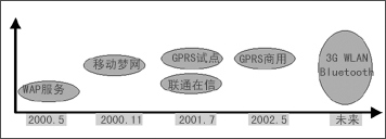 2000年5月,中國移動推出了WAP服務,但是由于準備不足,加之中國移動沒有完全轉(zhuǎn)變經(jīng)營理念,使得WAP服務沒有達到預期的發(fā)展目標。在吸取WAP服務的經(jīng)驗、教訓后,中國移動于2000年11月又推出了“移動夢網(wǎng)”計劃。在這次的業(yè)務推廣中,短消息受到了人們的寵愛,發(fā)展到現(xiàn)在,SMS已經(jīng)深入多數(shù)移動用戶的心中。2001年7月,中國聯(lián)通也推出了“聯(lián)通在信”與“移動夢網(wǎng)”進行競爭(如圖1所示)。與此同時,中國移動又開始了GPRS的試點工作,經(jīng)過近一年時間,“聯(lián)通在信”并沒有取得更好的成績,而中國移動的GPRS終于開始正式商用。那么,未來的移動數(shù)據(jù)業(yè)務將依托什么來發(fā)展呢?是3G,還是WLAN、藍牙?大家只能拭目以待。