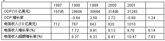 盡管電信運(yùn)營(yíng)業(yè)存在投資過度,并導(dǎo)致巨額虧損,但是過去幾年世界電信收入的增長(zhǎng)率高于GDP,平均為7.8 3%,顯示出電信運(yùn)營(yíng)業(yè)仍呈現(xiàn)出強(qiáng)勢(shì)發(fā)展特征。表中的數(shù)據(jù)表明:電信業(yè)仍是經(jīng)濟(jì)中最具增長(zhǎng)力量的部分。