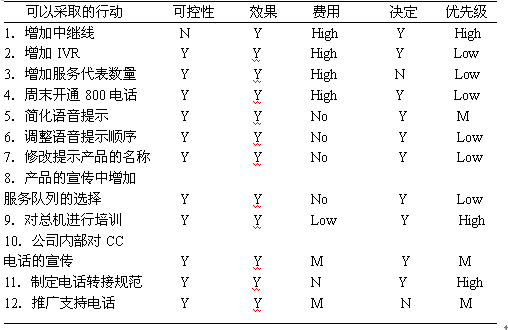項(xiàng)目小組接下來對列舉的眾多原因合并、歸類并再次進(jìn)行頭腦風(fēng)暴,并"可控性"、"實(shí)施預(yù)期效果"、"實(shí)施費(fèi)用"、"是否可以由項(xiàng)目小組作決定"、"優(yōu)先級(jí)"等幾個(gè)方面對可以采取的行動(dòng)進(jìn)行逐項(xiàng)分析(見下圖),最終確定1、5、9、10、11、12項(xiàng)納入到實(shí)施方案,指定相應(yīng)的實(shí)施負(fù)責(zé)人,制定相應(yīng)實(shí)施時(shí)間表,實(shí)施時(shí)長為三個(gè)月。