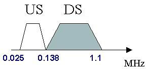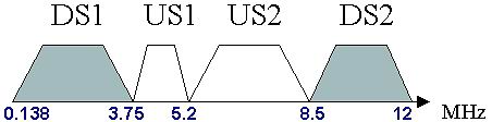 VDSL使用的頻譜較寬,最高可達(dá)12 MHz 。這一頻譜范圍可被分割為若干下行(DS)和上行(US)頻段,國際上常用的頻段劃分方式(Band