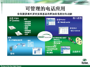 Sonus IP CENTREX解決方案主要基于可管理的語音數(shù)據(jù)綜合寬帶接入網(wǎng);能夠提供話音業(yè)務(wù)的應(yīng)用交換機(jī);能夠提供桌面話音業(yè)務(wù)的IP