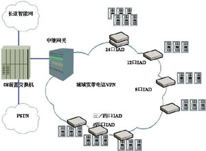 如圖4所示,該公司采用中興ZTE Softswitch系統(tǒng)部署了城域?qū)拵щ娫捪到y(tǒng),在城域網(wǎng)內(nèi)通過VPN組網(wǎng),各辦公地電話機(jī)通過多口IAD接入寬帶電話網(wǎng)絡(luò),通過在ZTE