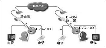 Modem上。圖1通過DI-604路由器與DSL Modem連接,實現(xiàn)與Internet互聯(lián)。DVC-1000還配備了一個電話機接口,可以外接一部普通電話機作為話音交流和撥號設備。