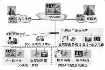 在安裝過程中,醫(yī)院通過原有的網(wǎng)絡系統(tǒng)就可完成視頻系統(tǒng)的搭建,該系統(tǒng)可應用于隔離區(qū)、護士監(jiān)控室、會議室、醫(yī)療診斷室、住院部等地方。每個房間只要安裝一臺DVC-1000,同時配備電視機或投影機等視音頻播放設備,通過上面所述的安裝程序,就可以搭建一套互動式的視頻系統(tǒng),這樣醫(yī)護人員只要在監(jiān)控室就可以隨時觀察隔離區(qū)的病人(如圖2所示)。