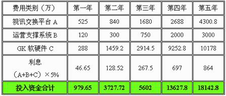 綜合上面三部分成本構(gòu)成,得出從系統(tǒng)建設(shè)并開始運(yùn)營的頭五年中,各個年份建網(wǎng)資金投入和總投入: