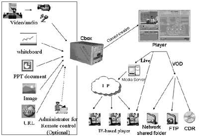 在對市場上現(xiàn)有產(chǎn)品進(jìn)行了綜合比較后,上海市稅務(wù)局決定使用美國Winnov公司的Cbox系統(tǒng)。Cbox是一種視頻采集和控制系統(tǒng),可以支持多種格式文檔,通過URL方式可以提供對未來文檔格式的支持,在操作時只需將文檔提供給Cbox,其余工作由Cbox自動完成; 自動攝像頭控制可預(yù)設(shè)三個位置,Cbox自動感應(yīng),并支持助教、直播、點播等模式,同時具有多種分發(fā)方式,可以存在局域網(wǎng)共享目錄、自動上傳至FTP和刻錄光盤。