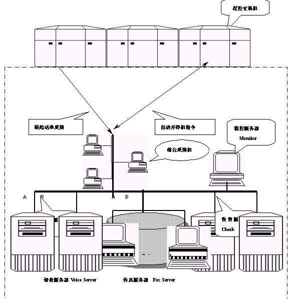 本系統(tǒng)可以分為:話單采集傳輸子系統(tǒng)、計費帳務處理子系統(tǒng)、收費服務子系統(tǒng)、語音查詢充值子系統(tǒng)、自動開停機子系統(tǒng)和監(jiān)控服務子系統(tǒng)六個模塊。
