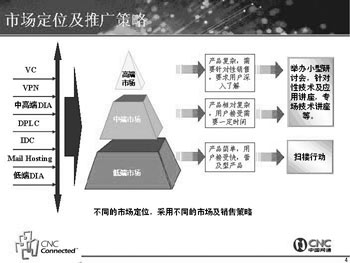 為了打開(kāi)網(wǎng)通視訊業(yè)務(wù)的局面,網(wǎng)通的推廣方案也非常完備,這位負(fù)責(zé)人向記者出示了一張圖(見(jiàn)左下圖),詳細(xì)地解釋了網(wǎng)通視訊業(yè)務(wù)的市場(chǎng)定位及推廣策略。首先是通過(guò)媒體宣傳給客戶以整體印象,力求覆蓋面廣,眾所周知; 接著以直郵形式有針對(duì)性地發(fā)放詳細(xì)單頁(yè)資料,深入宣傳;然后以小型研討會(huì)、技術(shù)講座等形式,有針對(duì)性地召集當(dāng)?shù)啬繕?biāo)客戶/潛在用戶,細(xì)論VC市場(chǎng)及產(chǎn)品; 最后是以巡展、樣板客戶案例造聲勢(shì),提高產(chǎn)品形象。