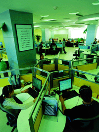 “目前這里每天要處理2000多個電話,一個月的電話量累計高達(dá)8萬個。每個坐席代表平均每天處理電話60次左右!彼上码娖鳎ㄖ袊┯邢薰矩(fù)責(zé)呼叫中心營運(yùn)的CRM推進(jìn)部副部長陳文凱說,“這是一個不輕松的工作崗位,因此,坐席代表的工作環(huán)境和工作待遇得首先得到保證。只有讓他們心情愉快,他們才能笑著去服務(wù)客戶!边@個寬敞舒適的工作大廳,就是基于這樣的思路設(shè)計出來的。每個坐席代表置身于扇形柔色的工作空間內(nèi),既能精力集中,又能避免回復(fù)電話的聲音互相干擾,一定角度的扇形空間發(fā)揮了最大的吸音效果。在大廳旁邊,還專設(shè)坐席代表休息室,每工作2小時后,他們可以到休息室休息一會。