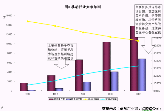 拿移動通訊業(yè)務(wù)來說,如圖3所示,截至到2002年底,中國移動的市場份額大約在65%,而聯(lián)通為35%左右,網(wǎng)絡(luò)覆蓋以及質(zhì)量也越來越趨同。從國內(nèi)國外的經(jīng)驗來看,移動通訊市場的競爭正從爭奪市場份額轉(zhuǎn)變?yōu)楸3质袌龇蓊~和增加客戶價值,而主要手段正也從網(wǎng)絡(luò)建設(shè)、營銷渠道建設(shè)、價格戰(zhàn)等轉(zhuǎn)變?yōu)楫a(chǎn)品戰(zhàn)和服務(wù)戰(zhàn)。在這個階段,兩家主要的運營公司都對客戶服務(wù)非常重視。服務(wù)水平的達標,投訴流程的梳理,呼叫中心的擴大規(guī)模,電話營業(yè)廳的建設(shè)等工作是今年的重點。