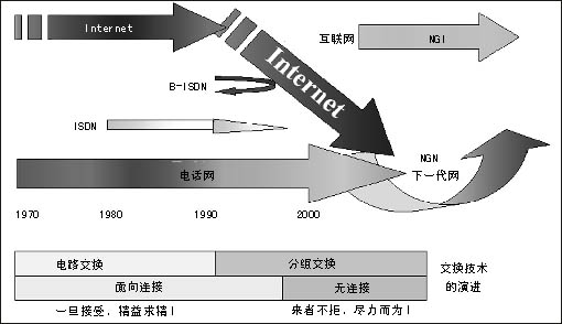 傳統(tǒng)電信網(wǎng)和互聯(lián)網(wǎng)都面臨著挑戰(zhàn),基于電話業(yè)務(wù)設(shè)計的電路交換網(wǎng)不能靈活適應(yīng)帶寬各異的數(shù)據(jù)業(yè)務(wù)的發(fā)展。專為數(shù)據(jù)業(yè)務(wù)設(shè)計的互聯(lián)網(wǎng)則存在著安全性、可管理性、商業(yè)模式等問題的困擾。NGI對目前電信網(wǎng)的主要盈利業(yè)務(wù)語音的質(zhì)量保證以及對電信網(wǎng)增長空間很大的業(yè)務(wù)(移動)關(guān)注不夠。NGI可能達(dá)到的目標(biāo)不能滿足電信界的需要。因此,在NGI之后ITU和ETSI等提出了更高的目標(biāo)——NGN,這就是NGN的提出背景。信息產(chǎn)業(yè)部電信研究院科技委副主任委員雷震洲認(rèn)為,兩大亮點(diǎn)點(diǎn)燃了NGN:一是數(shù)據(jù)超過語音的信息需求,全球互聯(lián)網(wǎng)用戶目前已逾7億,全世界在網(wǎng)上傳送的以IP為代表的數(shù)據(jù)業(yè)務(wù)量已經(jīng)超過語音業(yè)務(wù)量;二是移動超過固定的個性化需求,全球移動用戶已經(jīng)超過13億,近100個國家的移動用戶數(shù)已經(jīng)超過固定用戶數(shù),我國在2003年10月移動用戶也超過了固定用戶數(shù)。