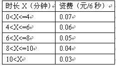 例3,國內(nèi)長途話費在時長不超過4分鐘的情況下,按0.07元/6秒收取;超過4分鐘但不超過6分鐘,統(tǒng)一按0.06元/6秒收。怀^6分鐘但不超過8分鐘,統(tǒng)一按0.05元/6秒收取;超過8分鐘但不超過10分鐘,統(tǒng)一按0.04元/6秒收;超過10分鐘,統(tǒng)一按0.03元/6秒收取。