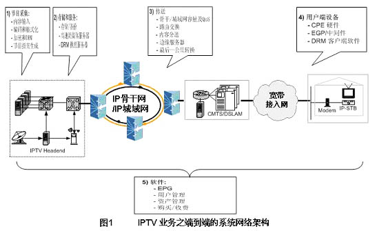 IPTV系統(tǒng)技術(shù)能用來提供將視音頻流媒體節(jié)目,如IP電視節(jié)目,從節(jié)目中心(first mile)播出,并通過骨干網(wǎng)、城域網(wǎng)和寬帶接入網(wǎng)(last mile)傳輸,直到被用戶接收之端到端的完整技術(shù)解決方案。一個(gè)端到端的IPTV系統(tǒng)一般具有節(jié)目采集、存儲(chǔ)和服務(wù)、節(jié)目傳送、用戶終端設(shè)備和相關(guān)軟件等五個(gè)功能部件。