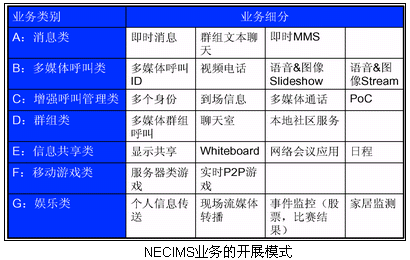 NEC的IMS系統(tǒng)已經可以在SIP終端上實現(xiàn)這些業(yè)務:PoC(手機一鍵通)、聊天、在線游戲、IM(即時消息)、Presence、多媒體呼叫、流媒體應用和視頻消息等業(yè)務。