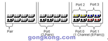 Fabric 接口的最小連接單元。端口的兩對差分信號被映像成一收一發(fā)的傳輸模式。下圖描繪了一個差分對、一個端口、以及一個通路的針腳分布。