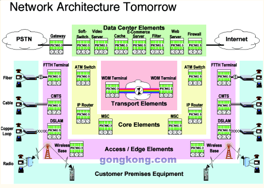 AdvancedTCA在電信網(wǎng)絡(luò)架構(gòu)中的位置如下圖所示: