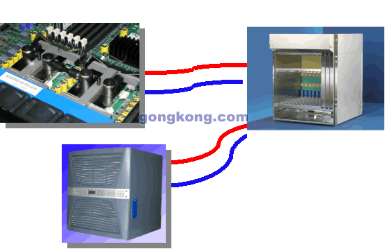 散熱原理: 由工業(yè)空調(diào)提供冷卻循環(huán)水,板卡上的“熱點(diǎn)”安裝液體散熱片,散熱片通過循環(huán)管道以及特殊連接器與背板連接,背板上由特殊連接器通過循環(huán)管道與工業(yè)空調(diào)的循環(huán)系統(tǒng)相連。板卡可以正常插拔,不會牽連循環(huán)管道。
