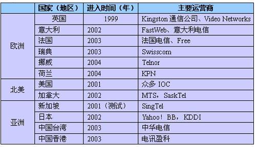 表1 部分國家和地區(qū)進入IPTV市場的年份及主要運營商