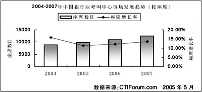 根據(jù)CTI論壇預(yù)測(cè),到2007年,銀行業(yè)呼叫中心的座席總數(shù)將達(dá)到12500個(gè),累計(jì)投資額將達(dá)到70億元。2005年到2007年的投資額復(fù)合年平均增長(zhǎng)率為14.86%。未來,銀行業(yè)在未來三年內(nèi)的發(fā)展穩(wěn)定,并以較高速度增長(zhǎng)。