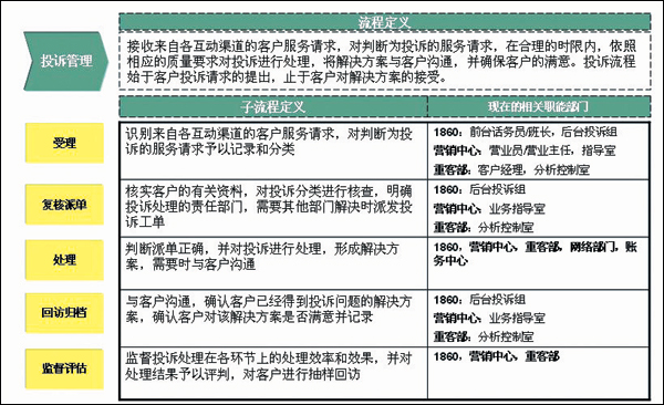 本項目的目標(biāo)是從客戶實際的感受出發(fā),完善面向客戶的服務(wù)及業(yè)務(wù)流程,深化“雙零”服務(wù)內(nèi)涵,增強服務(wù)的針對性和及時性,快速并妥善處理客戶投訴;落實“首問責(zé)任制”,建立以1860為受理主渠道的省、市兩級客戶投訴管理機制,形成以客服部為監(jiān)督考核部門、其他部門和單位為被考核者并形成各部門之間、上下游相互監(jiān)督的考核體制,